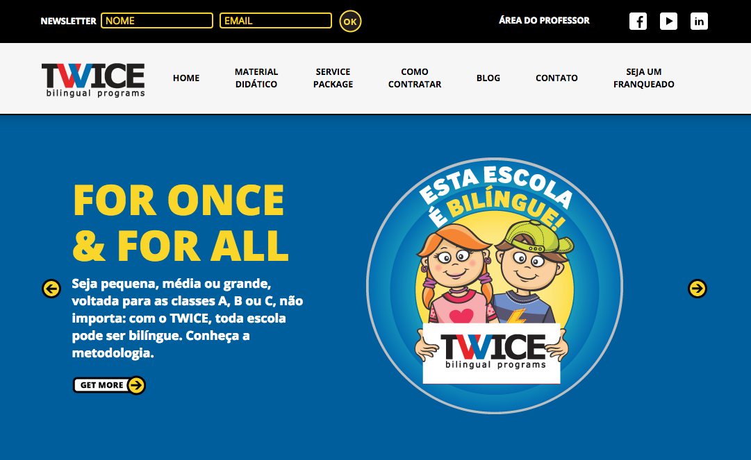 O Twice fornece o método de ensino, treinamento completo e material didático e multimídia para o ensino de língua estrangeira em centros educacionais. Acesse o site em www.twicebp.com.br.